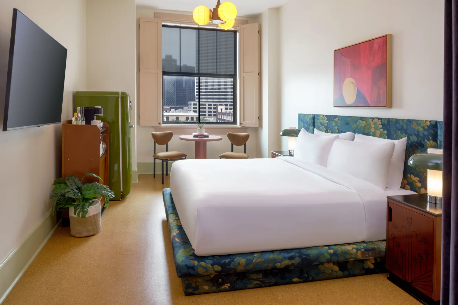 Settle into a plush king bed in a room filled with natural daylight from oversized windows. Original artwork and a cozy window seat add a touch of New Orleans charm, while sustainable cork flooring enhances the room’s modern, organic feel. A sleek workspace and thoughtful design make this a stylish retreat for work or relaxation.