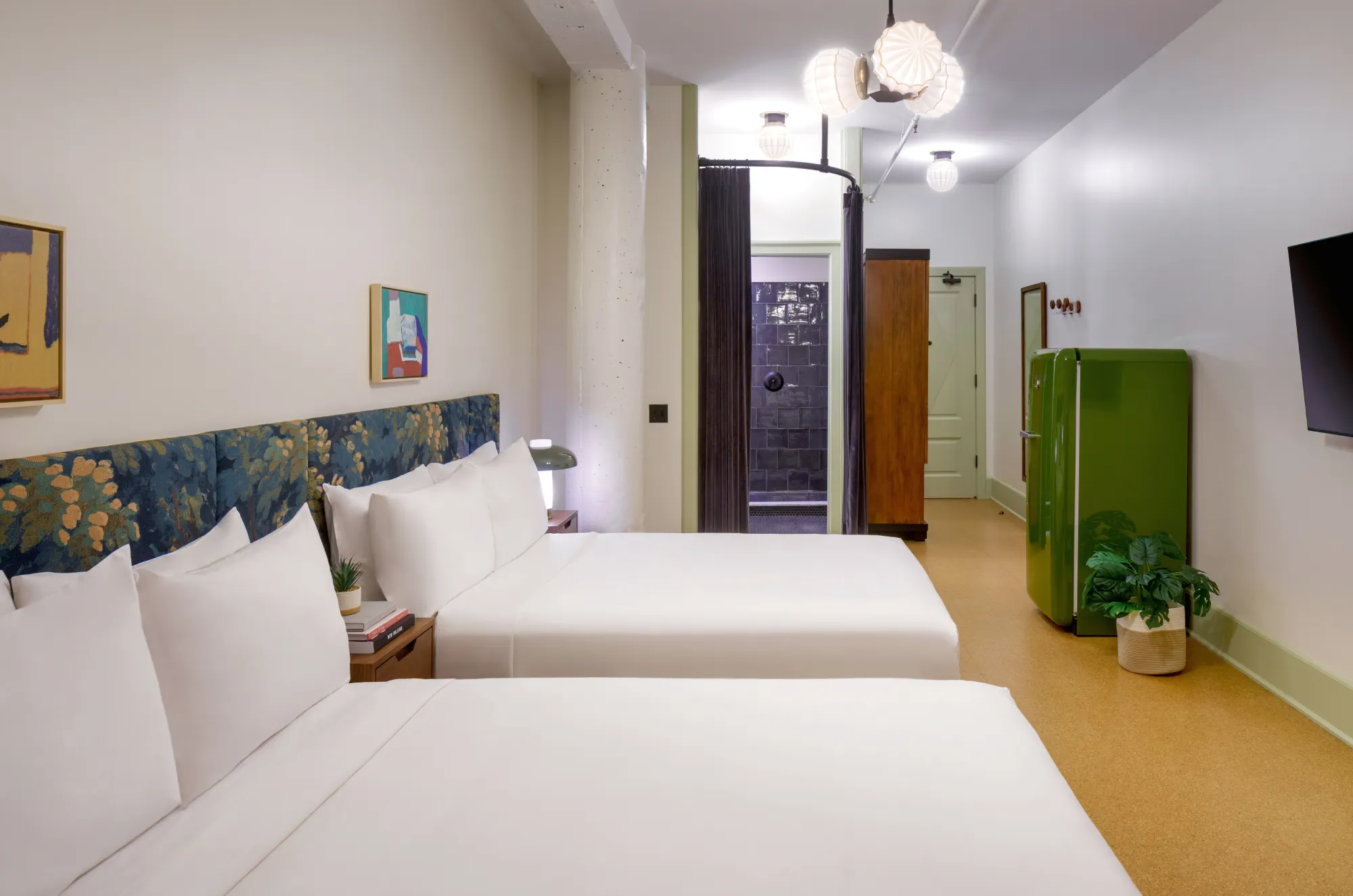 Two queen beds and contemporary furnishings set the tone for a stylish stay in this 480-square-foot room, complete with oversized windows filling the room with natural daylight. Cork flooring brings warmth and sustainability to the space, while the accessible bathroom offers a roll-in shower with grab bars, complemented by artisan bath amenities.