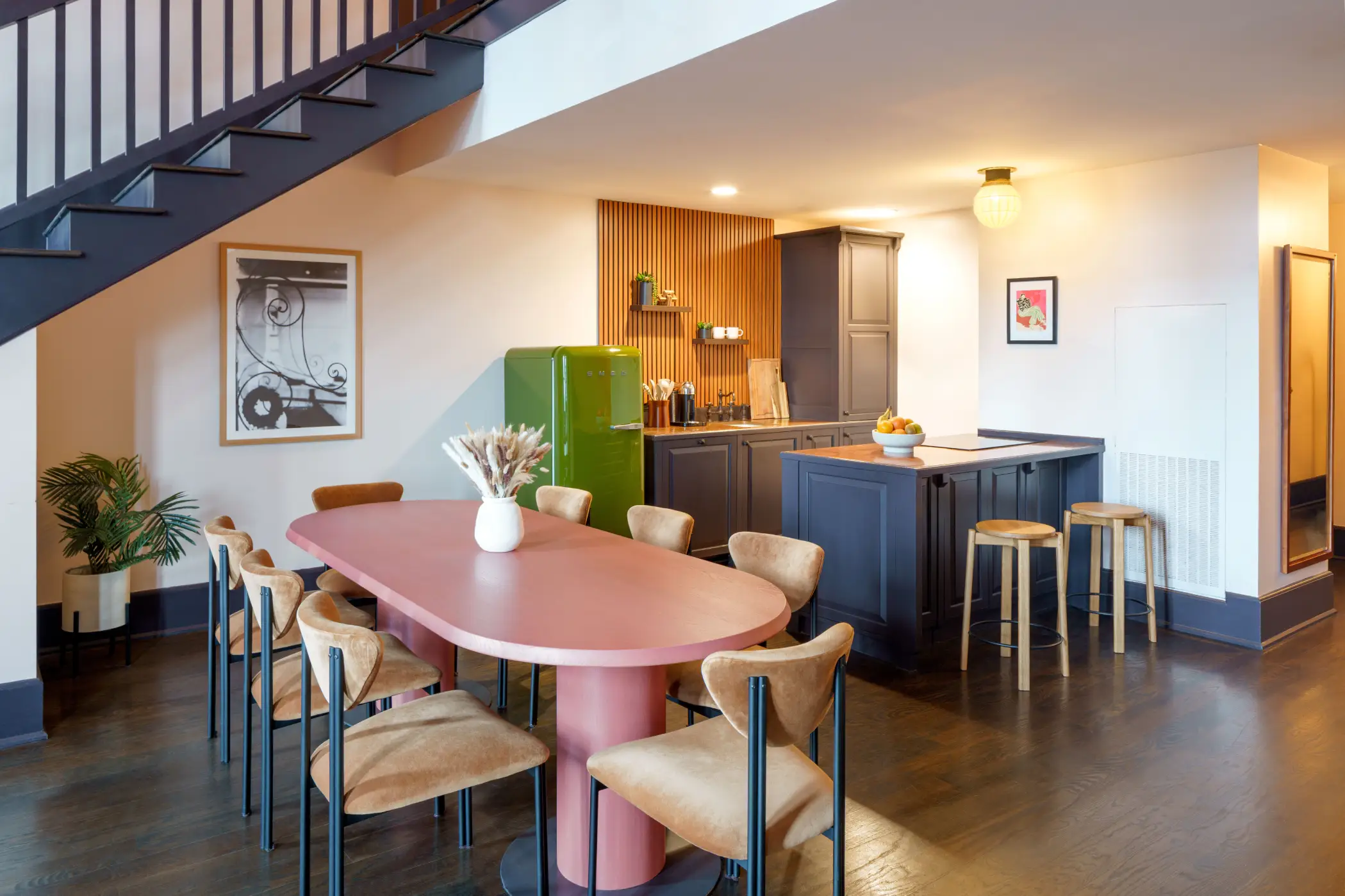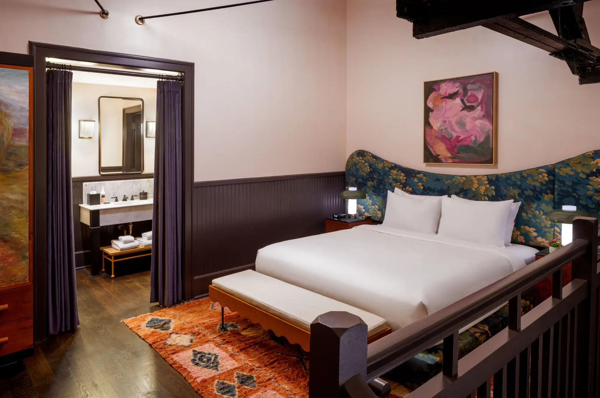 Spread out and entertain in this distinctive two-story suite featuring a king bed, spacious living area, and private outdoor terrace with sun loungers and bar-style seating for four. Thoughtful design details and mid-century furnishings bring warmth and sophistication to the space, while the wet bar adds a practical touch for hosting or relaxing. The luxe bathroom offers artisan bath amenities for the ultimate unwind.